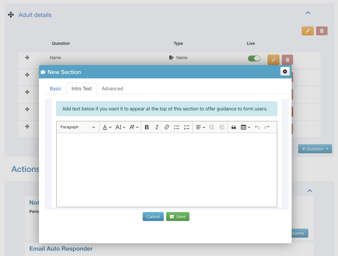 You can now add Intro Text to the Sections on your forms to give extra guidance to those completing the forms.